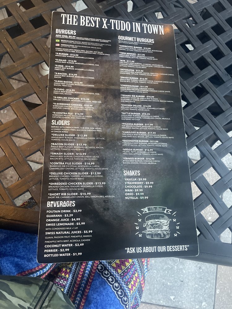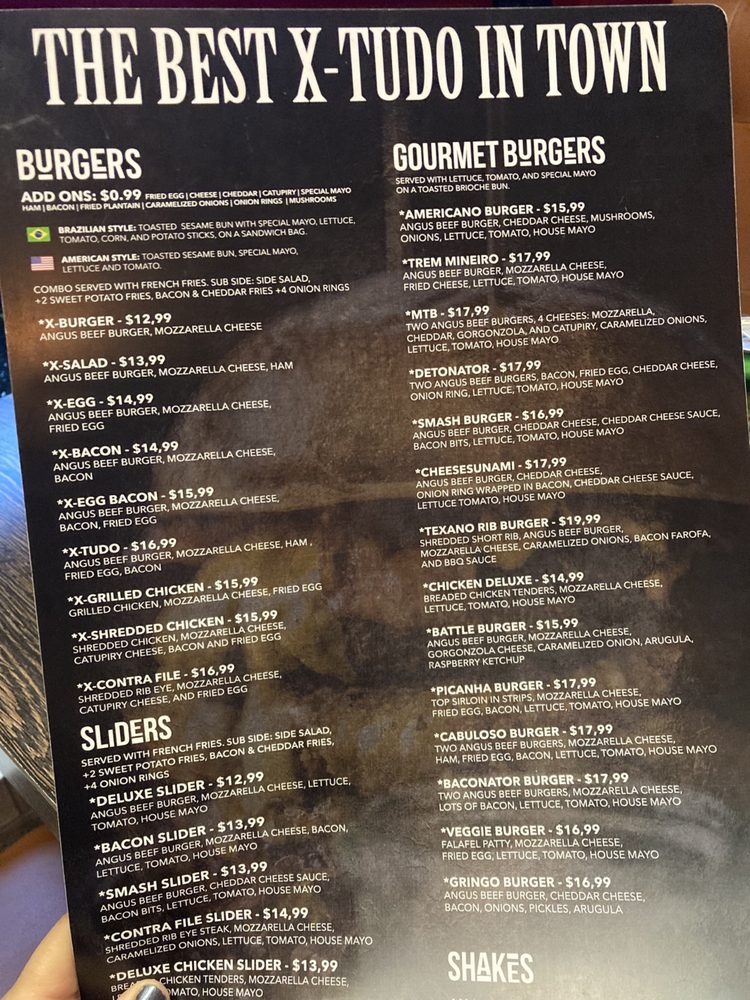 Double Angus beef burger, cheddar cheese, fried egg, bacon, onion rings, lettuce and tomato and Brazilian sauce on a toasted brioche bun