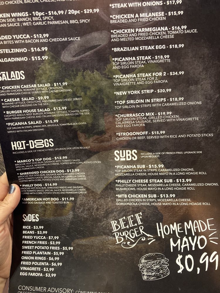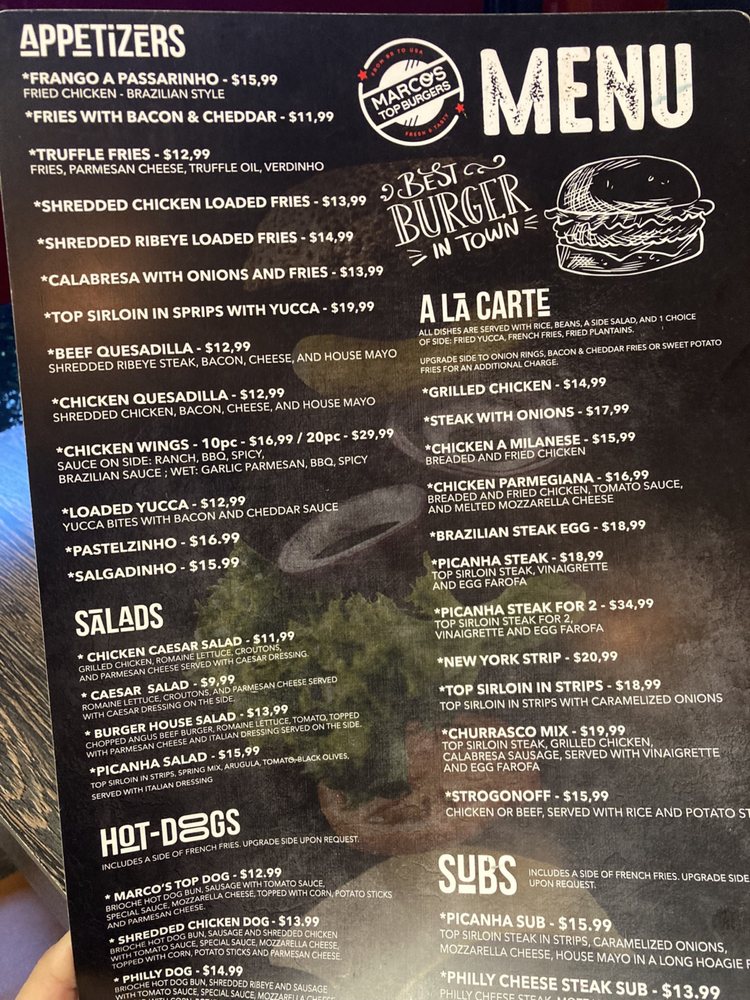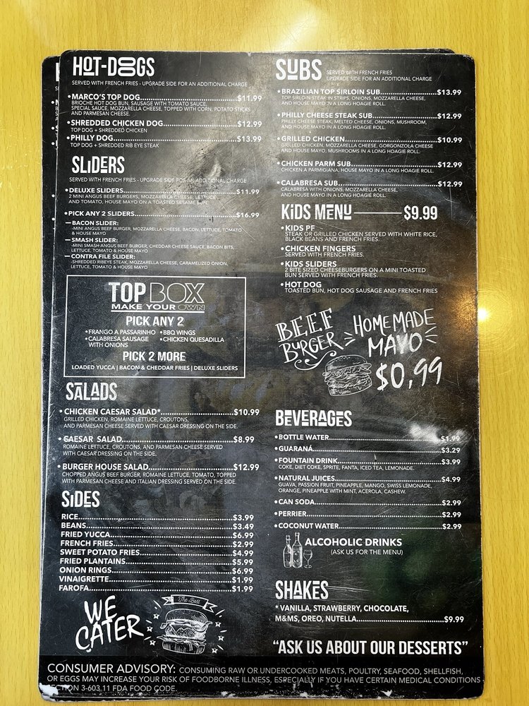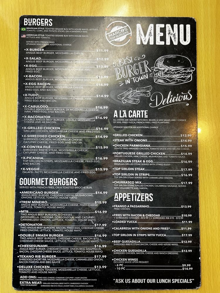Marco’s Top Burgers, located in Coral Springs, FL, offers a diverse menu of hot dogs, pizza, and most notably, mouth-watering burgers. With options like the X Burger and Cheesunami, customers rave about the delicious flavors and generous portion sizes. The atmosphere is trendy, with outdoor seating and a full bar to enjoy while indulging in their delectable creations. The attentive wait staff, like Gabriel and Adriana, enhance the dining experience by providing knowledgeable and friendly service. Customers also appreciate the variety of sides, such as bacon and cheese fries and onion rings, that perfectly complement the main dishes. From the first bite to the last, Marco’s Top Burgers leaves a lasting impression with its flavorful menu and inviting ambiance. Don't miss out on trying their unforgettable dishes like the Battle Burger and Ferraro Rocher chocolate mousse. Visit Marco’s Top Burgers today and treat yourself to a truly unforgettable dining experience.